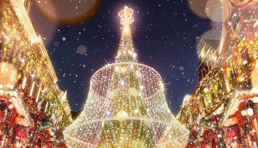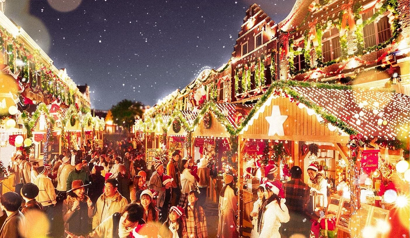 以歐式風情著名的九州遊樂園「豪斯登堡」,每年聖誕節都會舉辦冬季活動「European Holy Christmas」。2025年園內聖誕廣場矗立一座以水晶吊燈為靈感設計、全長約15公尺的巨型聖誕樹,無數燈光交錯閃爍,讓整座小鎮更加璀璨奪目。聖誕市集上則擺滿了各式聖誕商品、美食與手工藝品,還有特色聖誕紅酒,讓遊客在微醺中感受浪漫。