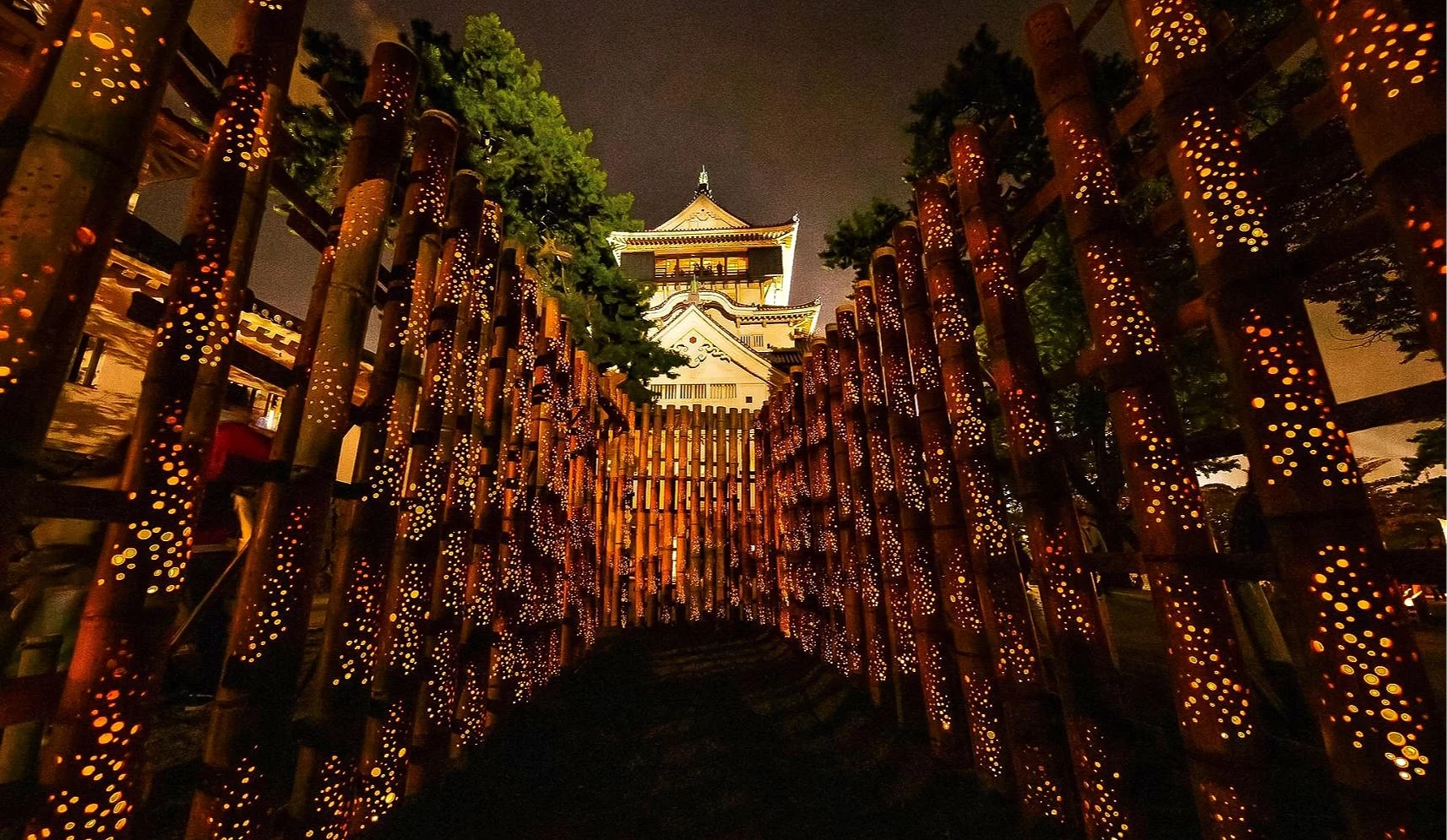 北九州擁有日本規模最大的竹林,浪漫的「小倉城竹燈」因而誕生。活動期間約3萬盞竹燈籠由市民志工親手製作,點亮整座城郭,從天守閣前廣場、虎之門到護城河邊,處處閃爍著柔和金光。成千上萬的竹燈在夜風中搖曳,映照出莊嚴又夢幻的城景,讓人彷彿置身光之海洋。