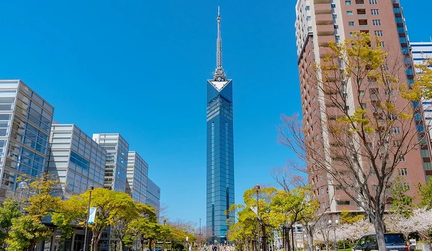 福岡塔是日本最高的海濱塔,高234公尺,提供360度全景視野,塔身以藍色與波浪線條設計,象徵天空與海洋。展望台分為三層,其中123公尺高的「SKY View 123」可俯瞰博多灣與福岡市區;116公尺的「SKY Play 116」設有戀人聖地、巨型扭蛋機與互動裝置;120公尺的「SKY Cafe & Dining Refuge」提供景觀座位與特色甜點。周邊景點包括地中海風情的Marizon與人工沙灘的百道海濱公園,適合情侶約會與親子同遊。