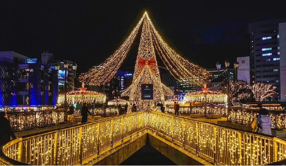 福岡冬季的亮點之一,就是沿著那珂川綿延的 「中洲光之降臨」聖誕燈飾。每年點燈期間,河岸兩側會被溫暖的金色與白色光芒包覆,倒映在水面上如同光之小徑,與中洲屋台的熱鬧氣息交織成最具福岡風味的夜景。沿著河畔散步,不僅能欣賞浪漫的燈飾,也能從不同角度眺望城市燈光。無論是拍照打卡、約會散步或在屋台享用福岡美食,都是冬季造訪福岡時不可錯過的限定景色。
