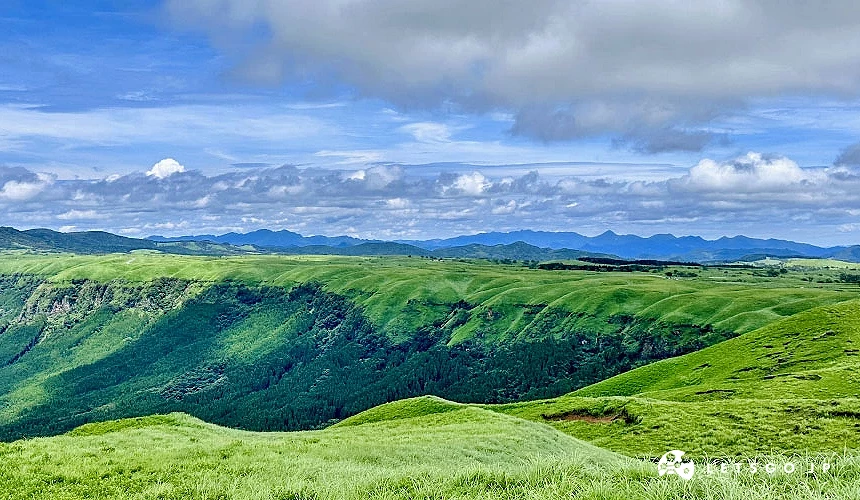 位於內牧溫泉東北方的「大觀峰」被譽為「可360度環視阿蘇火山群的絕景展望台」,這裡是曾因火山噴發而形成的北外輪山山峰之一,海拔935公尺,與下方的阿蘇谷相差有約400公尺的高度,是阿蘇地區知名的風景區。沿著步道慢慢走向觀景台,四周的草原彷彿地毯般在眼前鋪展開來,綿延在壯麗的外輪山地形之中,不僅能欣賞到360度的壯闊全景,一覽下方阿蘇的城鎮風光與宛如「臥佛」輪廓的「阿蘇五岳」,甚至能眺望到遠方的「九重連峰」,是拍照與沉浸阿蘇壯麗景緻的最佳地點。
