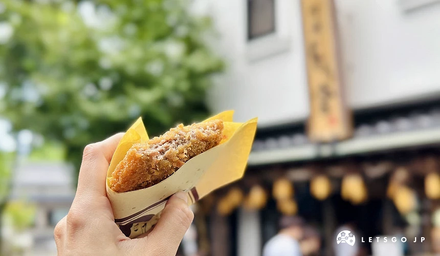 抵達此處的時間正逢中午用餐時段,推薦大家品嚐在地人氣美食赤牛料理、馬肉料理,其中的人氣餐廳「古民家餐廳 阿蘇はなびし」可以品嘗到多樣化的赤牛料理。建議一下車就前往門口登記排隊,再趁著等待的時間去逛逛商店街或神社。有30多年歷史的肉鋪「阿蘇TORI宮」(阿蘇とり宮)現炸出爐、香氣撲鼻的馬肉可樂餅以及炸赤牛肉餅也不可錯過,外酥內嫩,香甜超多汁,正餐前先來一顆墊墊肚子剛剛好!