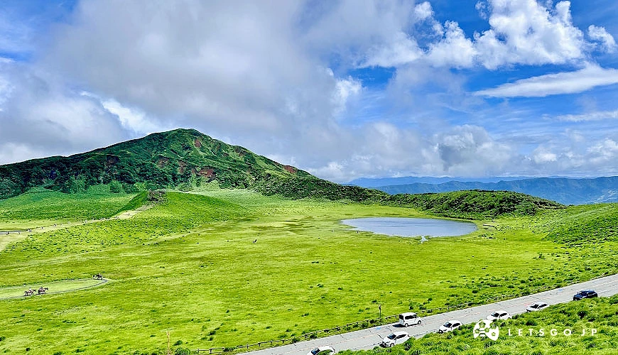最後一站停留於風光明媚的「草千里之濱」,這裡是阿蘇外輪山下最具代表性的自然景點之一。海拔約1,100公尺,寬78萬5千平方公尺的翠綠草原如畫布般鋪展在火山腳下,中央的天然火山湖泊倒映著天空與山影,馬群悠然漫步,遠處可見阿蘇中岳噴著白色煙霧的壯麗風光,景色寧靜療癒。夏天綠意盎然,冬季則幻化為銀白世界,甚至有機會欣賞到如夢似幻的樹冰美景。