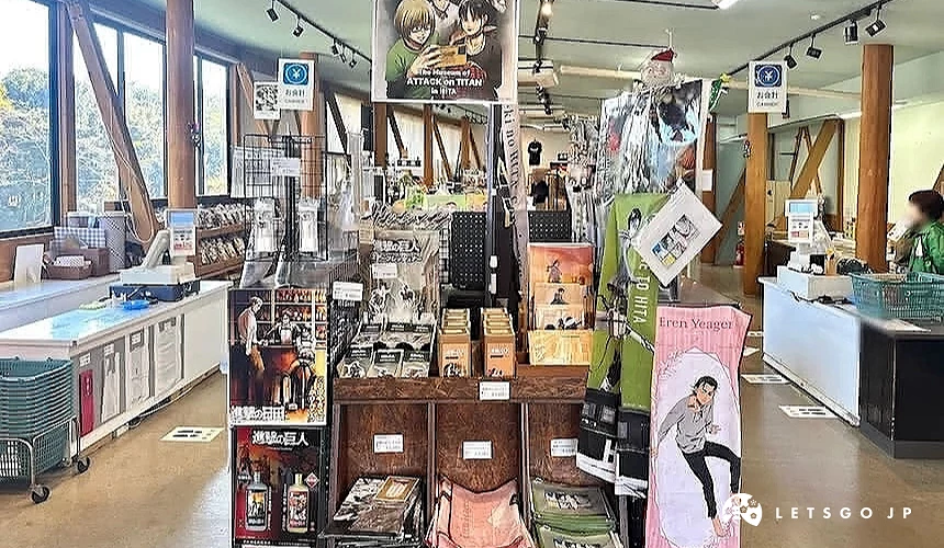 逛完後當然要入手周邊商品,如彈珠汽水、即食鮎魚釜飯、木屐等,都是與在地企業合作製成,甚至連諫山老師童年時常光顧的理髮店也推出了聯名洗護髮用品。這些商品不僅充滿創意,也展現了諫山老師對家鄉的濃厚情感,傳遞出溫暖的心意。博物館位於公路休息站「水邊之鄉大山」內,除了《進擊的巨人》相關商品,還有當地特色伴手禮和新鮮水果可供選購。園區內的「GELATERIA LAB3680 OKUHITA」提供與《進擊的巨人》合作設計的限定杯套,參觀後不妨過來看看。另外,如果有時間,也很推薦到別館的「進擊的巨人 in HITA 博物館 ANNEX」參觀!