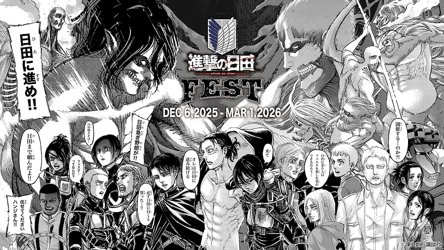 《進擊的巨人》粉絲注意了!2025年12月6日(六)至2026年3月1日(日),日田市會舉辦「進擊的日田祭典」,在日田市各個地方都會換上主題迎賓裝飾,包含特展、合作咖啡廳等等,最後一天2026年3月1日(日)還會舉行壓軸的特別活動,由《進擊的巨人》動畫聲優陣容登台,分享只有這裡才能聽到的幕後故事與精彩互動,為整個活動畫下最熱血的句點!