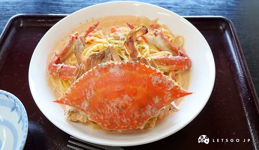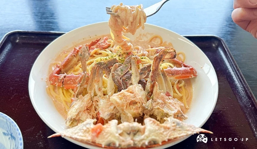 「梭子蟹番茄奶油醬義大利麵」裡放了一整隻的梭子蟹,餐點視覺吸睛。為了方便食用,螃蟹已經剝好殼,把蟹殼一翻開可以看到裡面的蟹肉與剪過的蟹腳;義大利麵的醬料是混合蟹肉、番茄、奶油去燉煮的,帶有濃郁奶香與些微番茄酸甜感還有螃蟹的鮮香,要把螃蟹單吃或是取出蟹肉混在麵裡一起吃都很不錯。由於每日數量限定,如果想吃的話,建議早一點前往店家才有機會品嚐。