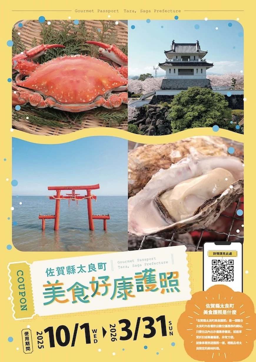 2025年10月1日到2026年3月31日,來自台灣和香港的旅客只要到佐賀縣太良町旅行,就能享受超值的「佐賀縣太良町美食好康護照」!這段期間共有27家在地人氣餐廳參與活動,只要在點餐時出示專屬優惠券,就能獲得各店準備的獨家小驚喜或優惠。美食護照的詳細資訊可以直接上官方網站查詢。另外,活動的宣傳單也放在佐賀國際機場的旅客服務中心和豐田租車佐賀機場店櫃檯,抵達佐賀機場時別忘了順手拿一張,讓你的太良町之旅吃得更划算更開心!