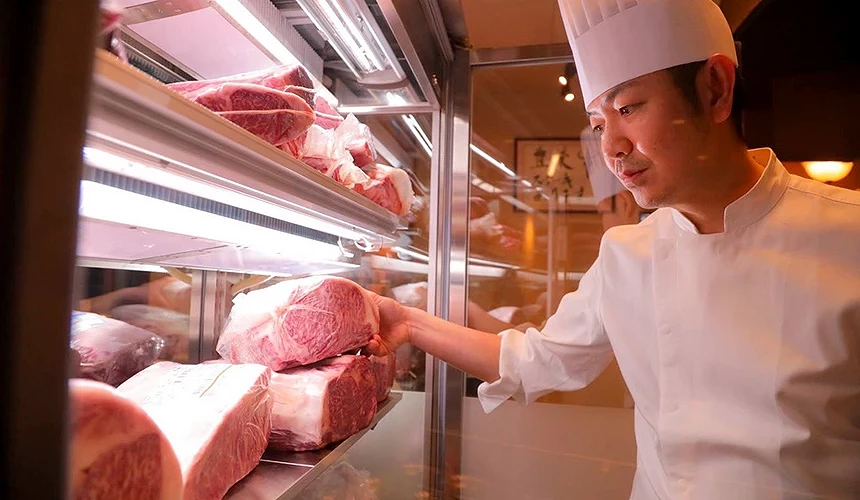 店家僅提供豐後牛中最高級的「大分和牛」,並直接於肉品處理現場挑選整頭牛,判斷肉質與脂肪狀態,並將切塊後的肉品送回店內,由主廚親自處理與烹調,力求完美呈現每一塊牛肉的風味。此外,店內設有新鮮肉品展示櫃,讓顧客能安心看到食材的新鮮度,吃得更放心。