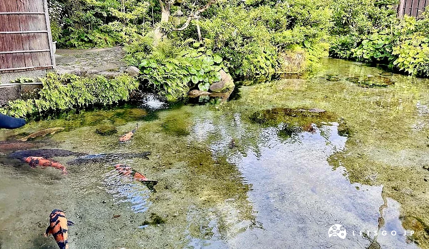 島原湧泉被列為「日本名水百選」,街道間潺潺湧流不息,形成獨特的「水之城下町」風景。街邊溝渠間可見色彩斑斕的鯉魚悠游,因此又被稱為「鯉魚游水街道(鯉の泳ぐ街)」。其中最具代表性的景點之一是「湧水庭園 四明莊」。這座建於明治時期的宅邸,以湧泉匯流而成的池水為中心,清澈見底,宛如玻璃鏡面,映照周圍花草樹木,錦鯉則悠然穿梭其中。旅人可在木造廊下坐下歇息,一邊品嚐以湧泉沖煮的香茶,一邊聆聽水聲、細賞庭園四季之景。