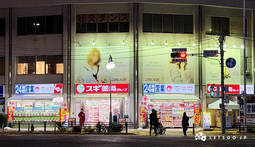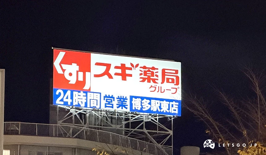 從博多車站「筑紫口(東4出口)」出站後,沿著車站前方的南北向道路往北步行,約 3~4 分鐘即可抵達「SUGI藥局博多車站東店」。店舖位於路口交會處,外觀醒目,且夜間24小時營業招牌相當好認,就算是第一次到博多,也不容易迷路。無論從車站回飯店途中順路採買,或是搭車前往福岡機場前來最後補貨,都十分便利!